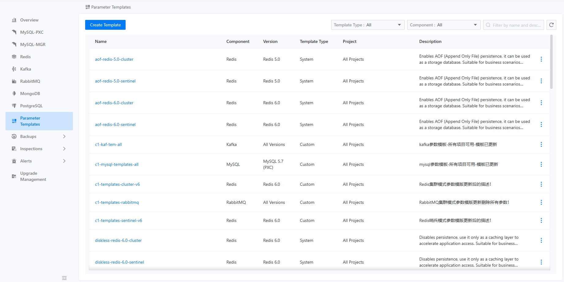 The parameter template feature is designed for the unified management and maintenance of parameter sets for various components. This includes viewing which parameters are included in the parameter templates, along with their default values and descriptions. Currently, the components that support parameter templates are MySQL (including PXC and MGR), Redis, and Kafka. The platform comes with pre-configured parameter templates for different scenarios and component specifications, representing industry best practices for use in those scenarios, thus allowing users to utilize them directly. Additionally, users can create custom parameter templates based on their specific business needs, facilitating internal standards implementation. All parameter templates can be selected for use when creating instances.
