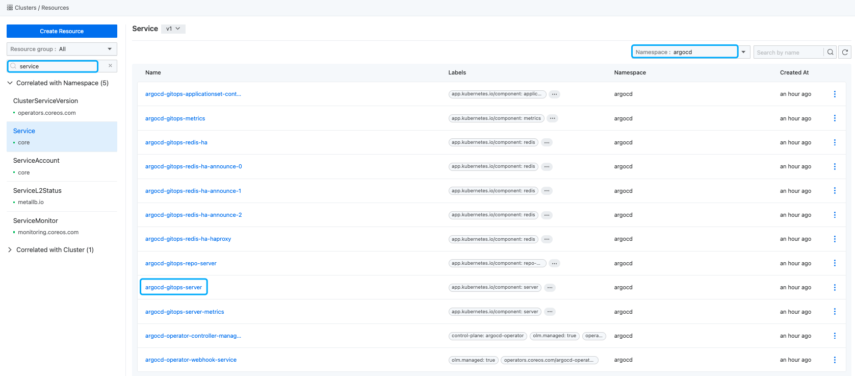 Service, select the argocd namespace (the namespace where the argocd instance is created). The default namespace for Argo CD installed on the web console is argocd. -
