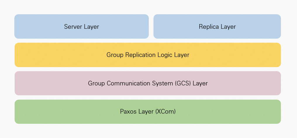 Under the Server layer and Replica layer of MySQL, group replication is divided into three layers: