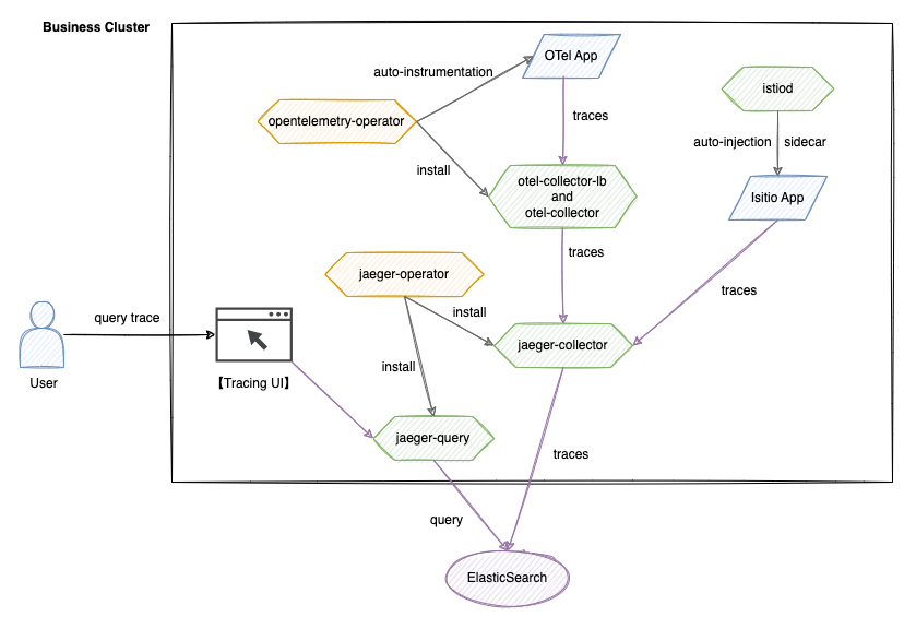 Application -> otel-collector -> jaeger-collector -> ElasticsearchThe application generates Span data via SDK or automatic injection, which is standardized by the otel-collector and subsequently persisted to Elasticsearch by the jaeger-collector.