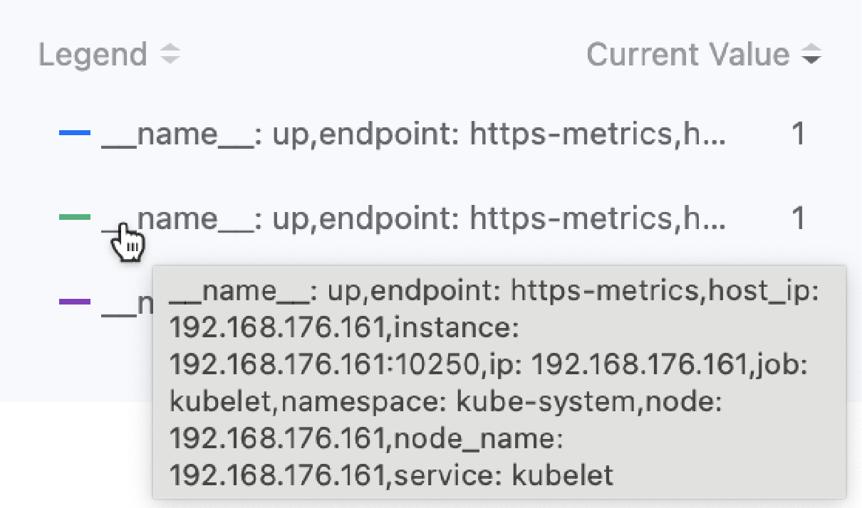 For example: The labels of the monitoring data obtained through the expression up{service="kubelet"} include "__name__":"up","endpoint":"https-metrics","instance":"192.168.18.2:10250","job":"kubelet","namespace":"kube-system","node":"192.168.18.2","service":"kubelet". If you want to use the target endpoint that collects data as the legend identifier, you can enter the legend parameter {{.instance}}. The display effect is as shown in the following figure.