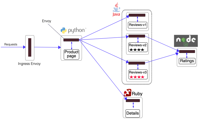 After injecting the Sidecar, the architecture of Bookinfo is shown below.